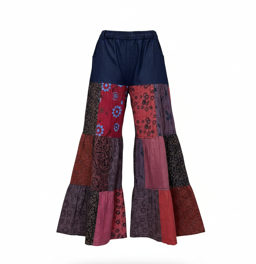 Handmade in Nepal by skilled Nepalese artisans, these Fair Trade hippie wide-leg pants are crafted from 100% pure cotton for all-day comfort and breathability. Featuring beautiful patchwork with vibrant prints, each piece reflects traditional craftsmanship and a free-spirited boho style.