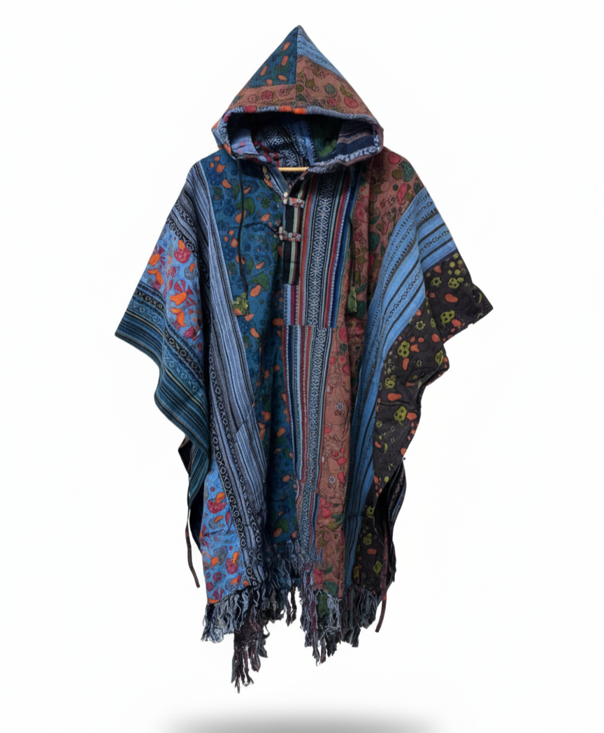 Clothing in Nepal, a leading handmade hippie clothing manufacturer and wholesale exporter offering the Unisex Handmade Fine Gheri Poncho, crafted in Nepal from premium Gheri cotton. Designed with intricate patterns and a relaxed fit, this poncho offers lightweight durability and versatility for any occasion